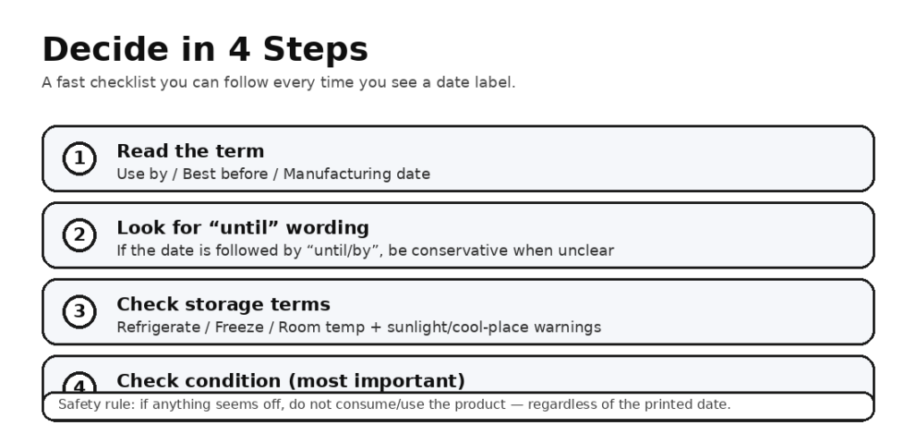 Decode Korean date labels into clear actions: Manufacturing date, Best before, Use by, “until” wording, and storage phrases.