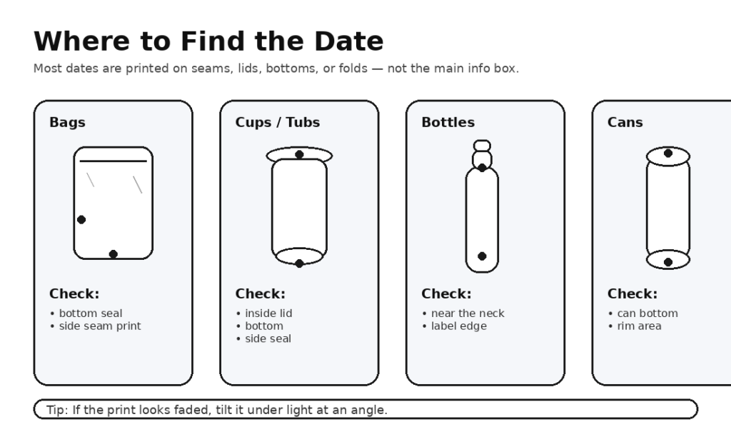 Dates are often printed on seams, folds, lids, or bottoms — not inside the main “info box.”